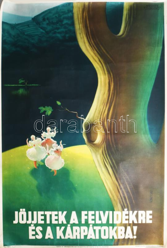 Konecsni György (1908-1970): Jöjjetek a Felvidékre és a Kárpátokba! Plakát, papÃr, jelzett a plakáton, Klösz Coloroffset, kiadja az Országos Magyar Idegenforgalmi Hivatal, javÃtott szakadásokkal, lapszéli apró szakadásokkal, feltekerve, 94,5×62,5 cm