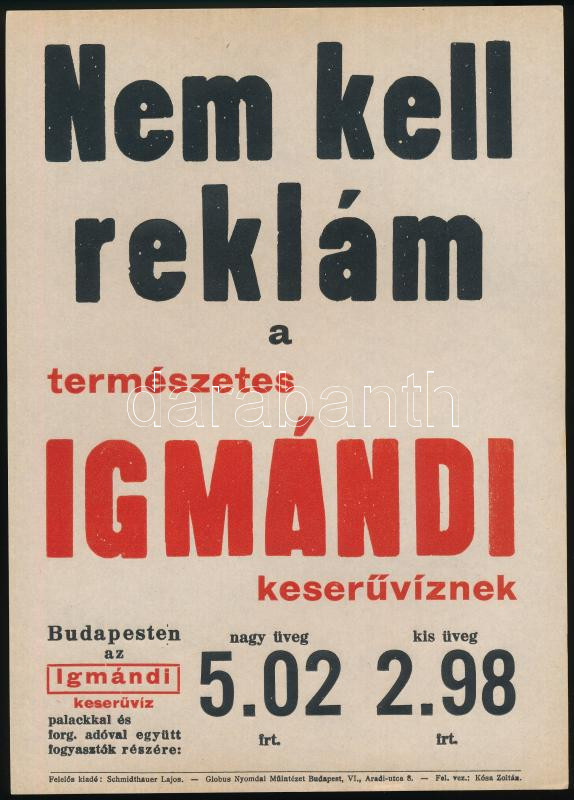 "Nem kell reklám (...)", Igmándi keserűvíz kisplakát, papír,... https://www.darabanth.com/de/45-Gross-Auktion/45.1/Poster/Poster~19003/Nem-kell-reklam-Igmandi-keseruviz-kisplakat-papir-Globus-Nyomda-Bp-24C39717-cm~II3447159
