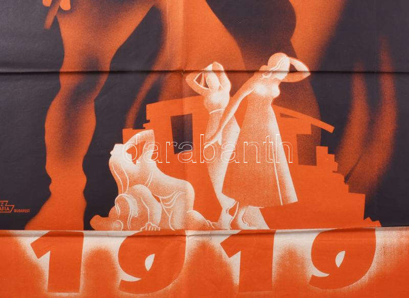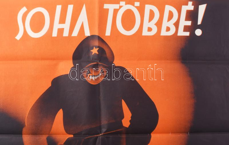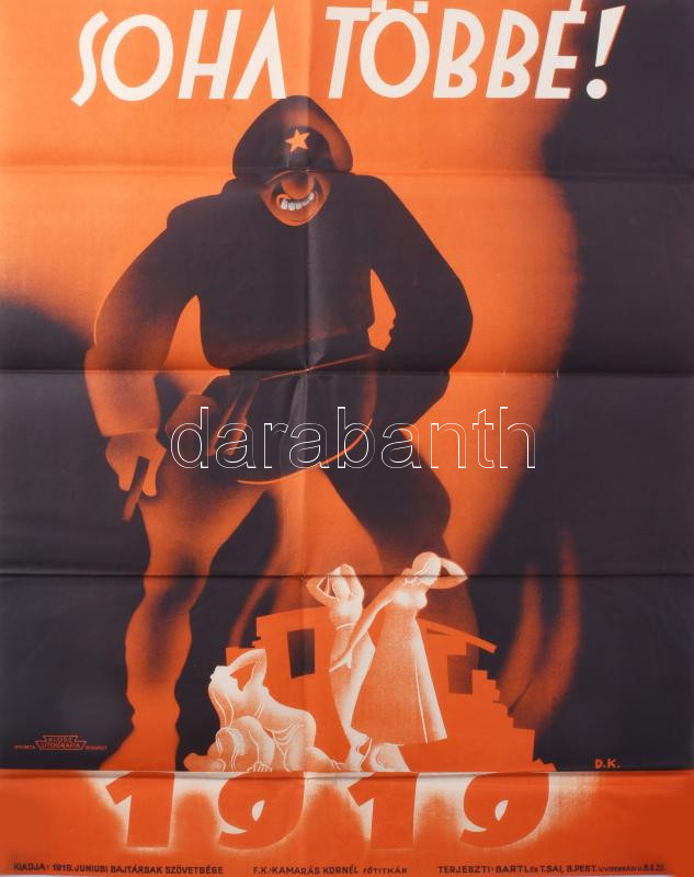 cca 1922-30 Soha többé! 1919. Litográfia, papír. D. K. jelzéssel a plakáton. Kiadja: 1919. Júniusi Bajtársak Szövetsége. Klösz Litográfia, Bp. 60x46 cm. Tanácsköztársaság elleni antikommunista-antibolsevista politikai propagandaplakát. Hajtva, apró szakadásokkal. Rendkívül ritka! / Hungarian anticommunist propaganda poster. Folded, with minor tears. Very rare!