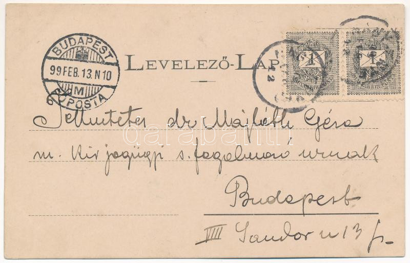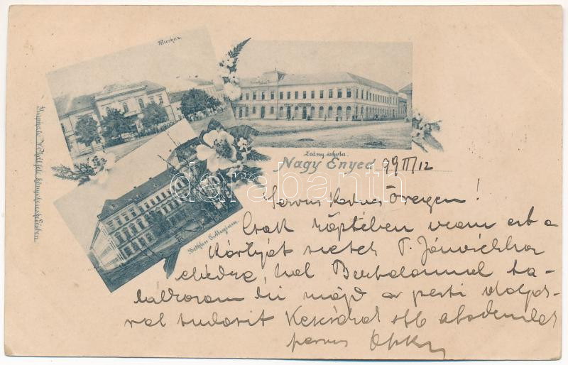 Beschreibung: 1899 (Vorläufer) Nagyenyed, Aiud; Városház, Leány iskola, Bethlen kollégium. Kapható Wokál-féle könyvkereskedésben / town hall, schools. Art Nouveau, floral
