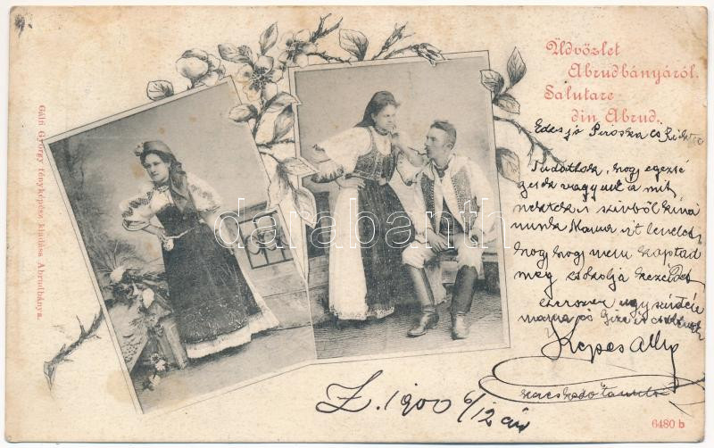Beschreibung: 1900 Abrudbánya, Abrud; népviselet. Gálfi György fényképész kiadása / folklore. Art Nouveau, floral (EK)