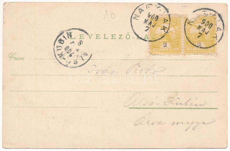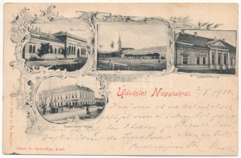 1900 Nagylak, Nadlac; Városháza, Városi óvoda, Fő tér, állami elemi iskola, üzletek. Leopold Jakab és fia kiadása, Bloch H. nyomdája / town hall, kindergarten, main square, school, shops. Art Nouveau, floral (fa)