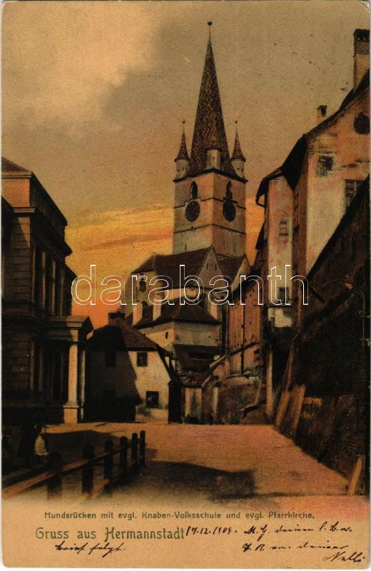 1904 Nagyszeben, Hermannstadt, Sibiu; Hundsrücken mit evgl. Knaben Volksschule und evgl. Pfarrkirche / Evangélikus templom és fiú iskola / street, Lutheran boy school and church (EK)