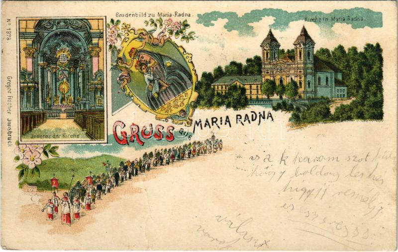 1907 Máriaradna, Mária-Radna, Radna (Lippa, Lipova); Kirche, Gnadenbild, Inneres der Kirche / Kegytemplom, belső, búcsújáróhely, körmenet / pilgrimage site, pilgrimage church, interior, procession. Art Nouveau, floral, litho (fa)