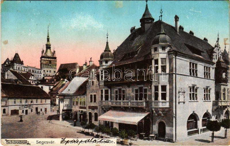 Beschreibung: 1913 Segesvár, Schässburg, Sighisoara; Gewerbevereins-Gebäude / Iparpalota, gyógyszertár, Fazekas üzlete. W. Nagy kiadása / trade palace, pharmacy, shops (ázott / wet damage)
