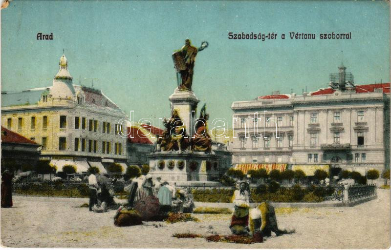 Beschreibung: Arad, Szabadság tér, Vértanú szobor, piac, Mihalik József, Heim és Brunner Béla üzlete / square, monument, shops, market (ragasztónyomok / gluemarks)