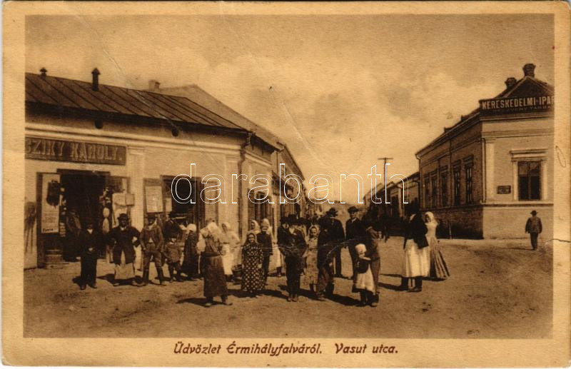 Érmihályfalva, Valea lui Mihai; Vasút utca, Kereskedelmi és Iparbank, Sziky Károly üzlete. Glück Lajos kiadása / street view, shops, bank (gyűrődések / creases)