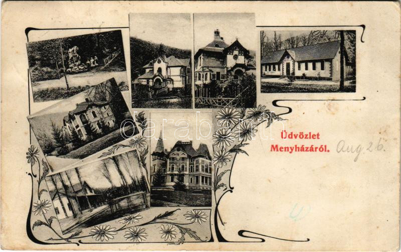 Beschreibung: Menyháza, Monyásza, Moneasa; nyaralók. Patkó Vilmos amateur felvétele / villas. Art Nouveau, floral + "MENYHÁZAFÜRDŐ P.U." (fl)