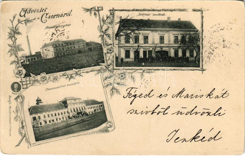 Beschreibung: 1899 (Vorläufer) Csorna, Szarvas szálloda, Frankl gőzmalom, Praemontrei rendház, Martincsevics arcképe és saját kiadása. Art Nouveau, floral (EB)
