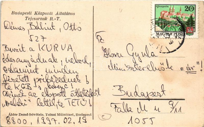 Budapest V. Erzsébet téri kioszk, oldal terasz. Budapesti Központi Általános Tejcsarnok R.T. Horn Gyula miniszterelnök úrnak címezve 1997. február 19-én, politikai ellenfelétől becsmérlő üzenettel (EK)
