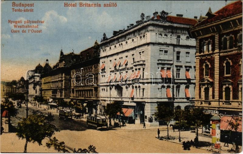 Budapest VI. Teréz körút, Nyugati pályaudvar, Hotel Britannia szálloda... https://www.darabanth.com/de/450-Fernauktion/450.0/Ansichtskarten/Ungarn~1500008/Budapest-VI-Terez-korut-Nyugati-palyaudvar-Hotel-Britannia-szalloda-villamos-gyogyszerta~II2670465