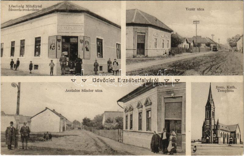 Budapest XX. Pestszenterzsébet, Pesterzsébet, Erzsébetfalva; Vezér utca, Asztalos Sándor utca, Római katolikus templom, Löschnig Mihályné üzlete és saját kiadása. Erzsébet fényirda