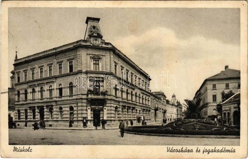 Beschreibung: Miskolc, Városháza és jogakadémia, dohány tőzsde üzlete (Rb)