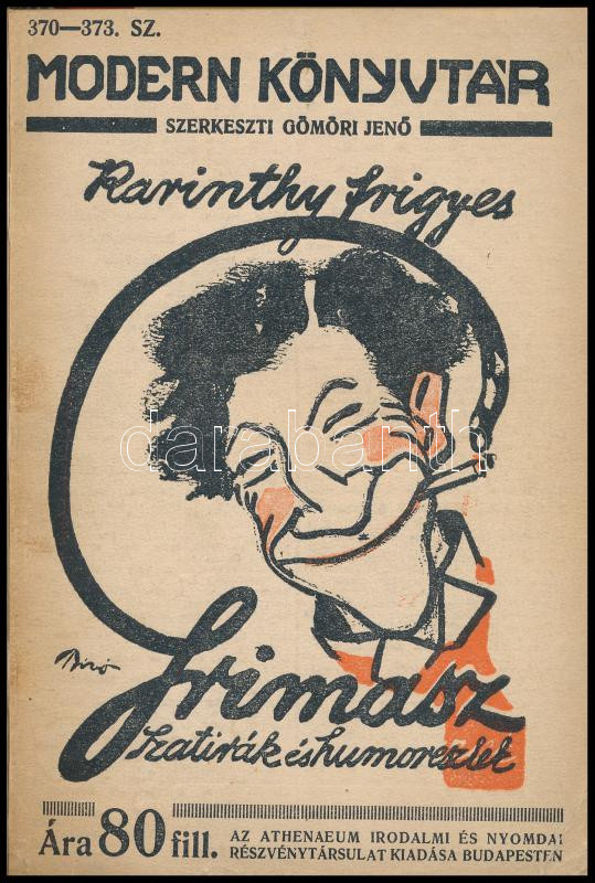 Karinthy Frigyes: Grimasz. Szatírák és humoreszkek. A borító illusztrációja Bíró Mihály (1886-1948) munkája. Modern Könyvtár 370-373. sz. Bp.,[1914],Athenaeum, 128 p. Első kiadás. Átkötött félvászon-kötés, bekötött eredeti illusztrált papírborítóval.