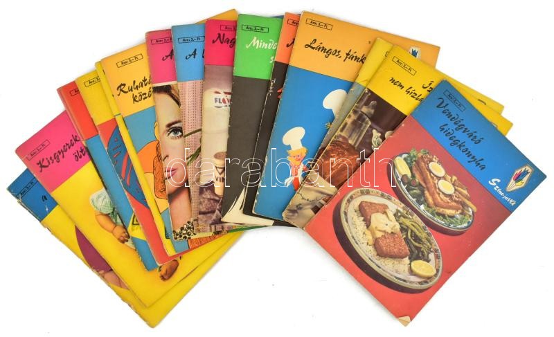 Színe-Java sorozat 16 füzete: Ízletes, nem hízlaló ételek; Ételek, ízek, fűszerek; Mindennapi szépségápolás; Nagytakarítás-nagymosás; A lakás növényei; Az öltözködés titkai; stb. Bp., 1968-1974, Minerva. Kiadói tűzött papírkötés, vegyes állapotban.