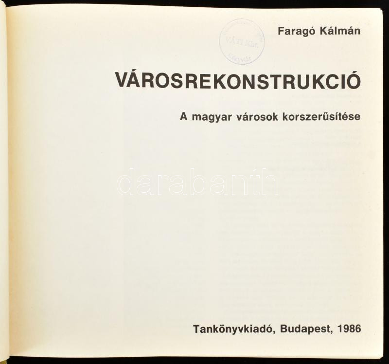 Faragó Kálmán: Városrekonstrukció. A magyar városok korszerűsítése. Bp., 1986, Tankönyvkiadó. Kiadói kartonált papírkötés, sérült gerinccel. Megjelent 2000 példányban.