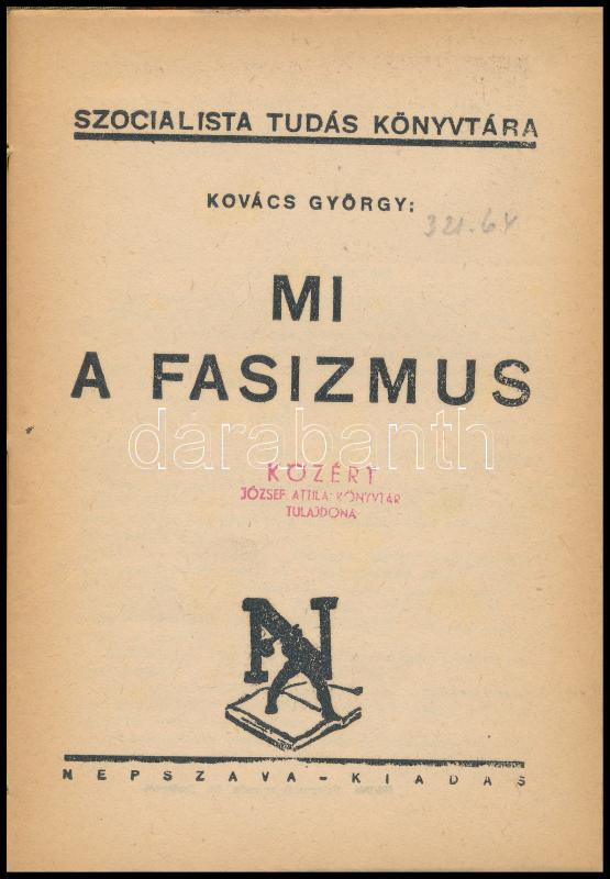 Kovács György: Mi a fasizmus. Szocialista Tudás Könyvtára. Bp.,én.,Népszava, 37 p. Átkötött félvászon-kötés, kissé kopott borítóval, intézményi bélyegzéssel.