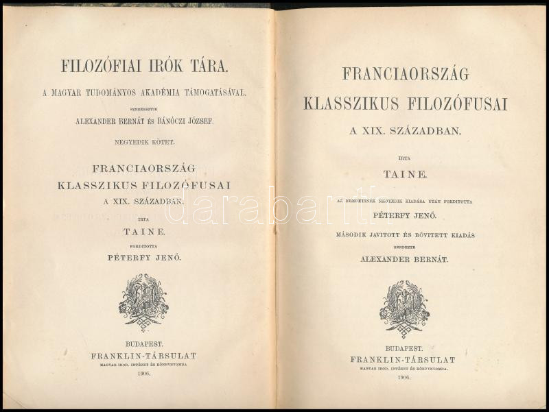Taine, [Hippolyte]: Franciaország klasszikus filozófusai a XIX. században. Fordította: Péterfy Jenő. Sajtó alá rendezte: Alexander Bernát. Filozófiai Írók Tára két kötete IV. köt. Bp., 1906, Franklin. Átkötött félvászon-kötés, kissé kopott borítóval.