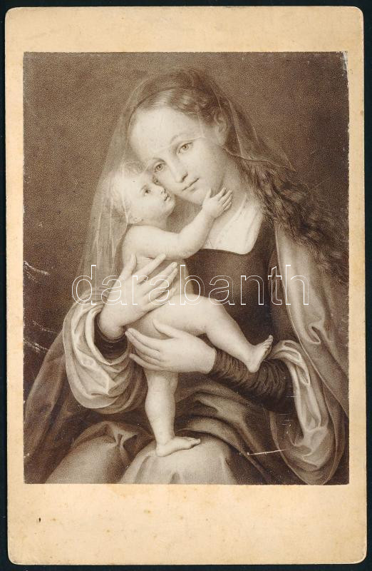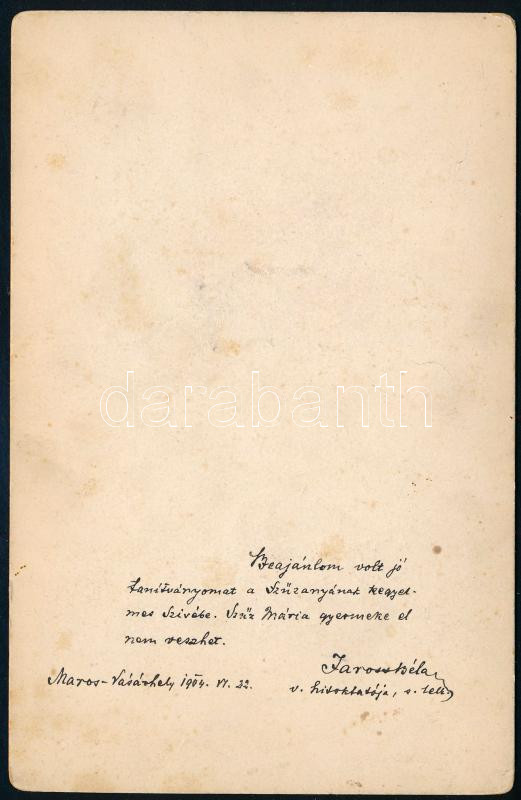 1904 "Szűz Mária a kis Jézussal" festményről készült keményhátú fotó, a hátoldalán: "Beajánlom volt jó tanítványomat a Szűzanyának kegyelemes szívébe. Szűz Mária gyermeke el ne veszhet. Maros-Vásárhely, 1904. VI. 22. Jaross Béla v. hitoktatója, s. lelk", 16x11 cm: A hátoldalon: Jaross Béla (1877-1959) római katolikus plébános, pápai prelátus, egeresi címzetes apát, marosi főesperes, marosvásárhelyi plébános saját kezű ajándékozási soraival, saját kezű aláírásával.
