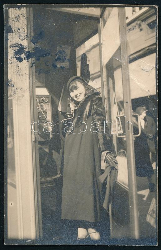 Beschreibung: 1932 Budapest, hölgy telefonfülkében, fotó, felületén törésnyom, foltos, 7,5×5 cm