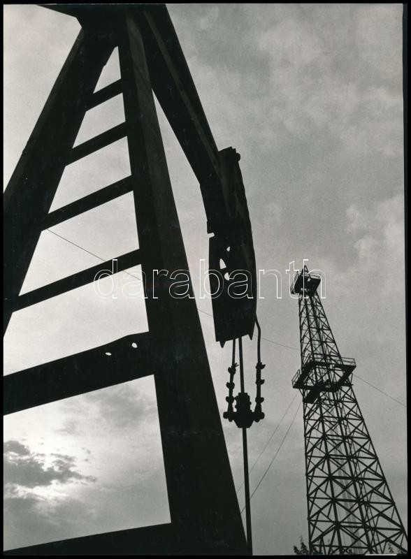 1975 Regős István Károly pécsi fotóművész feliratozott vintage fotóművészeti alkotása (Fúrótorony Zalaegerszeg határában), ezüst zselatinos fotópapíron, 24x17,5 cm