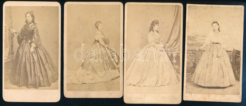 cca 1860-70 össz. 4 db keményhátú női portré fotó, 3 db pesti (Licskó J., Gévay Béla, Canzi és Heller) és 1 db egri (Mihály József) műteremből, részben kissé foltos és kopott, 10x6 cm körüli méretekben