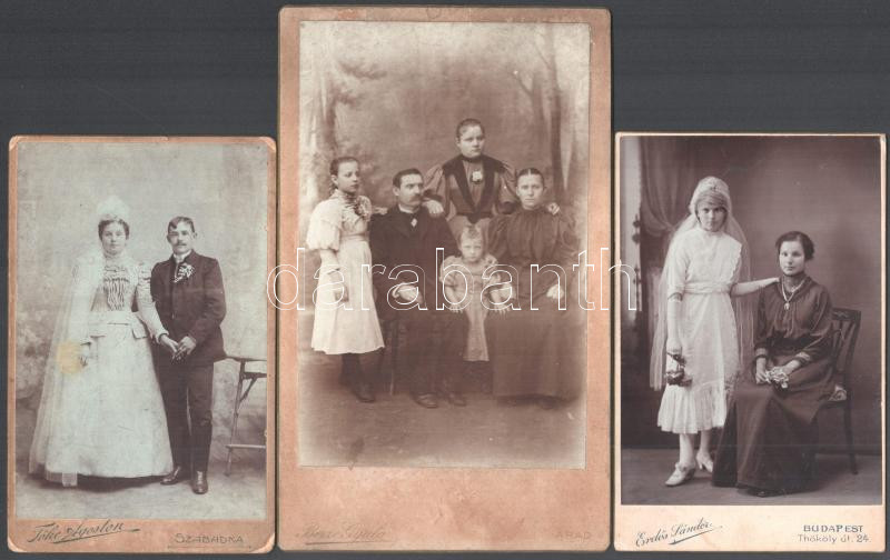 cca 1895-1910 Családi képek, 3 db keményhátú kabinetfotó, különböző műtermekből (Berze Gyula Arad, Erdős Sándor Budapest, Tőke Ágoston Szabadka), változó állapotban, 16,5x10,5 cm és 21,5x13 cm