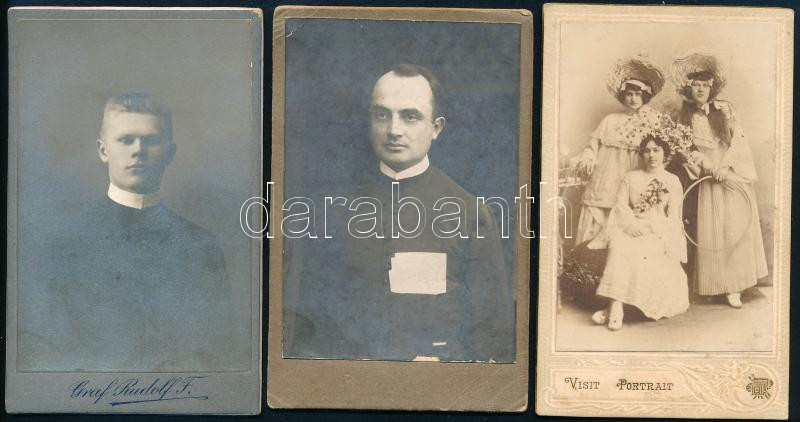 cca 1900 Vegyes keményhátú fotó tétel, 3 db, közte 2 pap fotójával, valamint divatos hölgyek csoportképével, közte 1 db Graf Rudolf F. (Eger és Mezőkövesd) műterméből, 10x6 cmx3