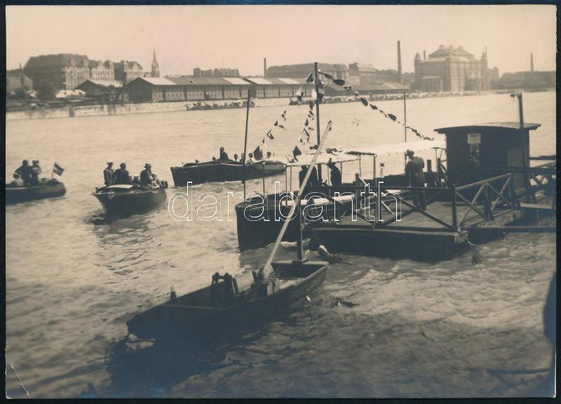 Beschreibung: cca 1930 Dunai motorcsónakok kikötése Budán a közraktárakkal és az Elevátorházzal szemben 18x12 cm