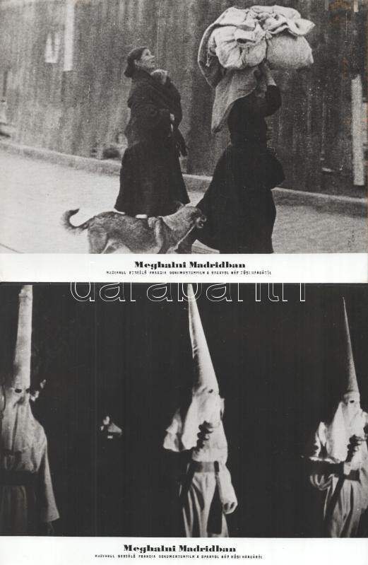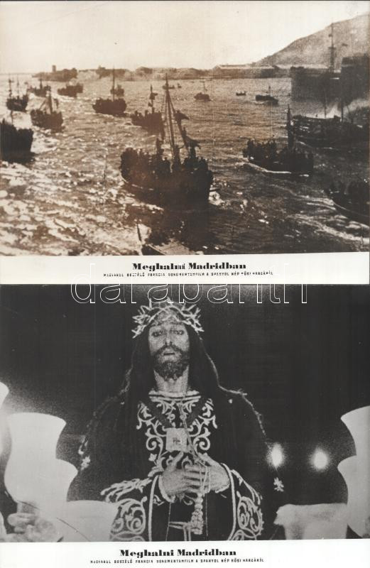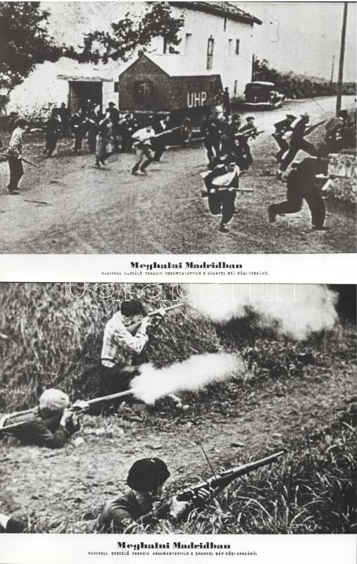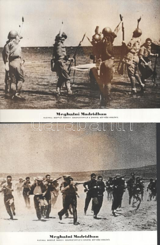 cca 1963 ,,Meghalni Madridban - s spanyol polgárháború" című francia dokumentumfilm jelenetei és szereplői, 11 db vintage produkciós filmfotó ezüst zselatinos fotópapíron, a használatból eredő (esetleges) kisebb hibákkal, két kép elszíneződött, 18x24 cm