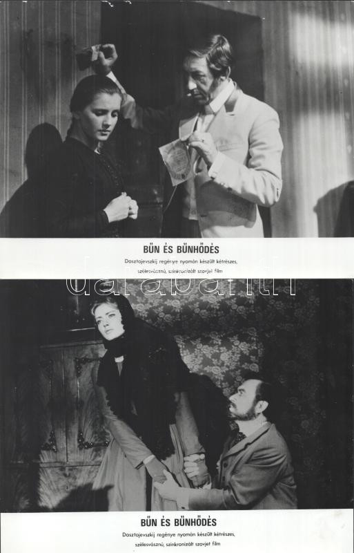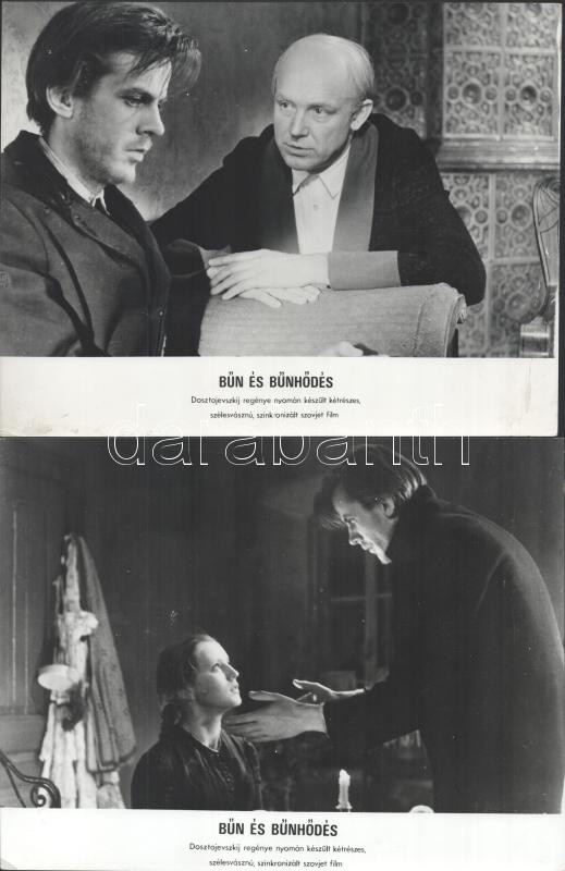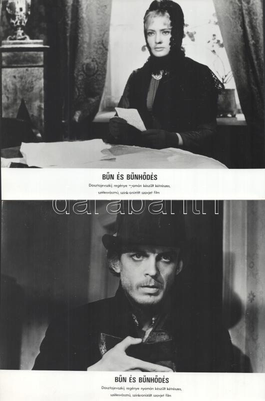 cca 1970 Dosztojevszkij regénye nyomán készült ,,Bűn és bűnhődés" című szovjet film jelenetei és szereplői, 16 db vintage produkciós filmfotó ezüst zselatinos fotópapíron, a használatból eredő (esetleges) kisebb hibákkal, 18x24 cm