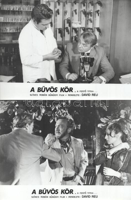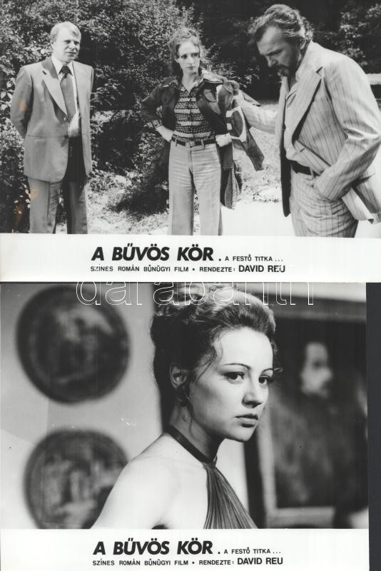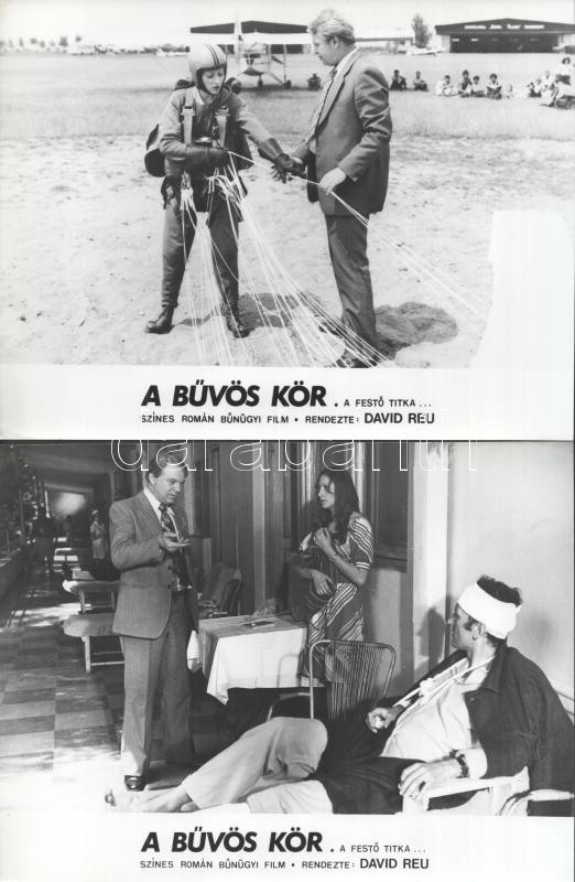 cca 1975 ,,A bűvös kör" című román bűnügyi film jelenetei és szereplői, 15 db vintage produkciós filmfotó ezüst zselatinos fotópapíron, a használatból eredő (esetleges) kisebb hibákkal, 18x24 cm