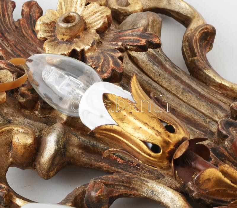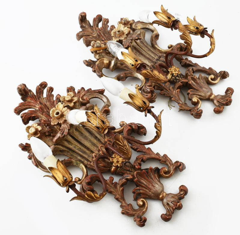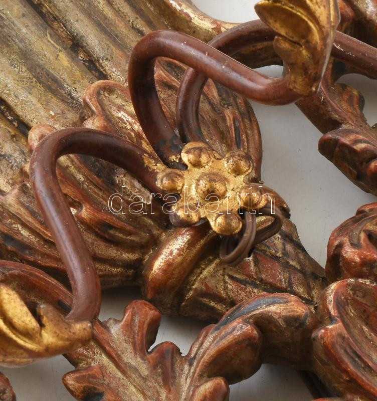 Antik neobarokk falikar pár, háromkaros, díszes barokk stílusú formavilágra faragott, fém, fa, aranyozott. Pótolt gyertyákkal, javított, de összességében jó állapotban, 51x27 cm