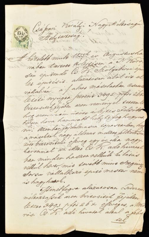 Beschreibung: 1855 Nagykőrös, Gál József kőrösi építő mester kérelme a helytartótanácshoz, 15 kr. okmánybélyeggel, hajtott, szakadt.