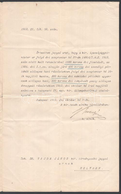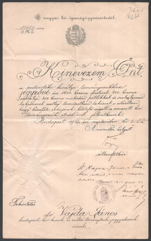 1912 Törvényszéki jegyzői kinevezés államtitkári aláírással, papírfelz... https://www.darabanth.com/de/450-Fernauktion/450.0/Kunst-Dokumente-andere-Sammelgebiete/Dokument~500022/1912-Torvenyszeki-jegyzoi-kinevezes-allamtitkari-alairassal-papirfelzetes-viaszpecsette~II2992651