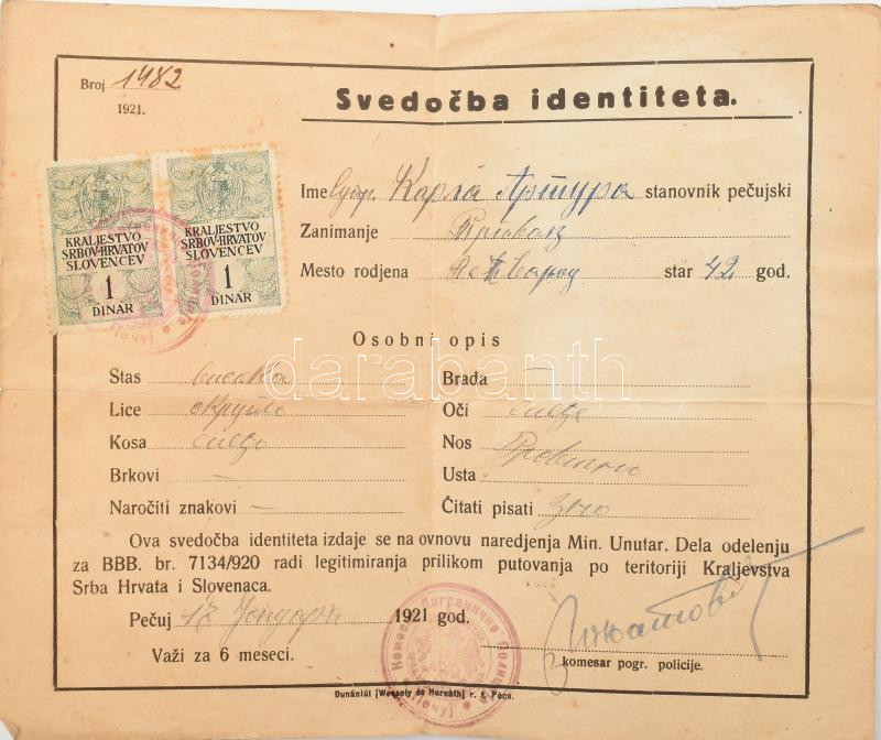 1921 Szerb-Horvát-Szlovén Királyság, fényképes személyazonossági igazo... https://www.darabanth.com/de/450-Fernauktion/450.0/Kunst-Dokumente-andere-Sammelgebiete/Dokument~500022/1921-Szerb-Horvat-Szloven-Kiralysag-fenykepes-szemelyazonossagi-igazolvany-belyegzokkel~II2993612