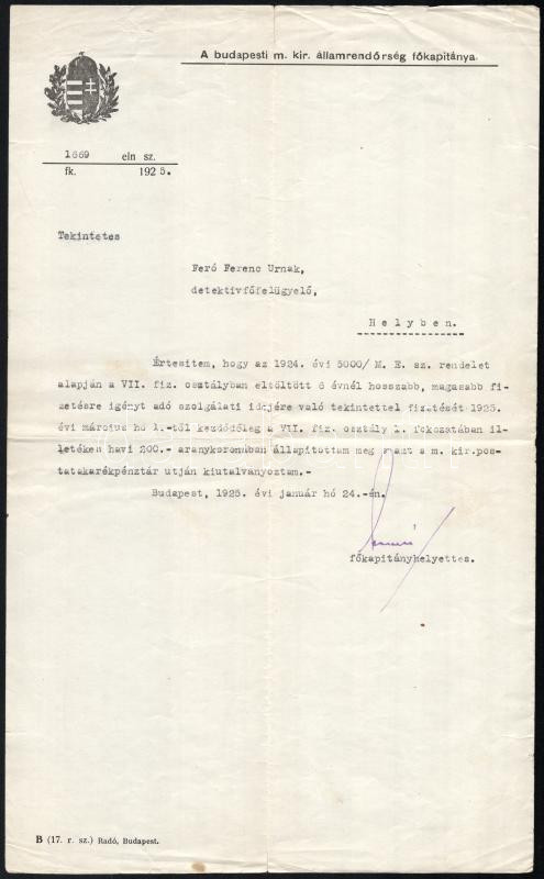 1925 Bp., A Budapesti M. Kir. Államrendőrség főkapitánya által kibocsá... https://www.darabanth.com/de/450-Fernauktion/450.0/Kunst-Dokumente-andere-Sammelgebiete/Dokument~500022/1925-Bp-A-Budapesti-M-Kir-Allamrendorseg-fokapitanya-altal-kibocsatott-okirat-detektiv-r~II2989167