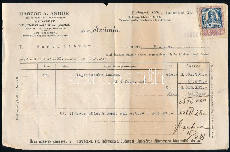 1926 Bp., Herzog A. Andor bor, pálinka, likőr, rum és tea nagyban fejl... https://www.darabanth.com/de/450-Fernauktion/450.0/Kunst-Dokumente-andere-Sammelgebiete/Dokument~500022/1926-Bp-Herzog-A-Andor-bor-palinka-likor-rum-es-tea-nagyban-fejleces-szamla~II2988493