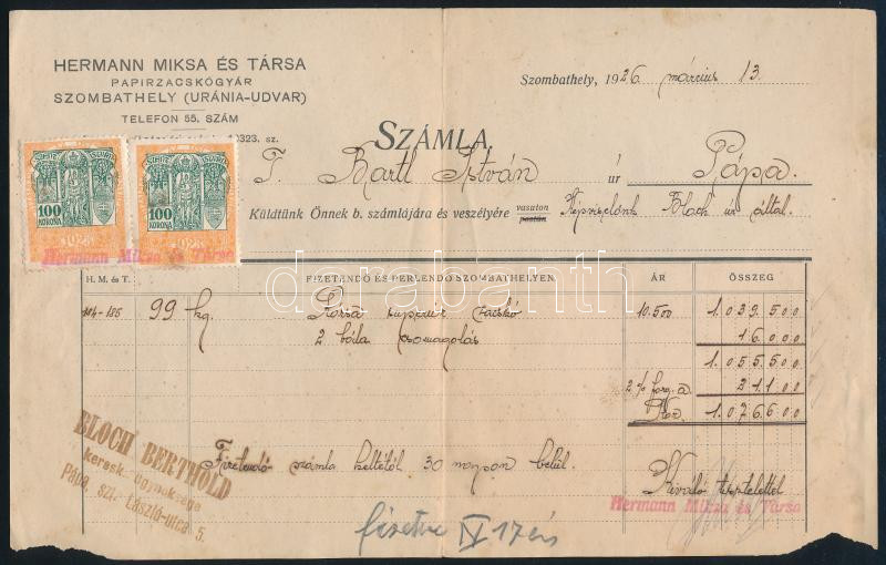 1926 Szombathely, Hermann Miksa és Társa Papírzacskógyár fejléces szám... https://www.darabanth.com/de/450-Fernauktion/450.0/Kunst-Dokumente-andere-Sammelgebiete/Dokument~500022/1926-Szombathely-Hermann-Miksa-es-Tarsa-Papirzacskogyar-fejleces-szamla~II2988664