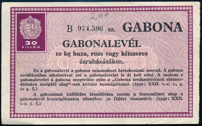 Beschreibung: 1930 30 fillér gabonalevél 10 kb búza, rozs vagy kétszeres átruházásához