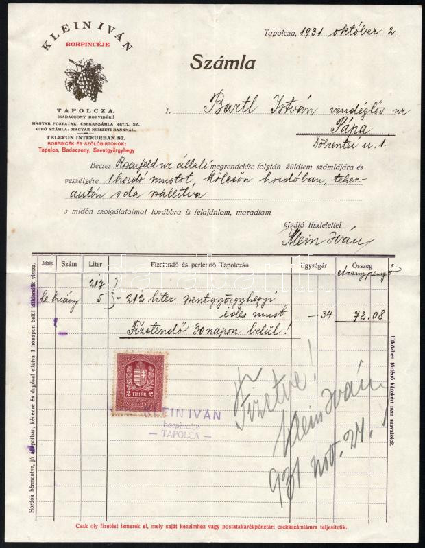 1931 Tapolca, Klein Iván Borpincéje: Tapolca, Badacsony, Szentgyörgy-h... https://www.darabanth.com/de/450-Fernauktion/450.0/Kunst-Dokumente-andere-Sammelgebiete/Dokument~500022/1931-Tapolca-Klein-Ivan-Borpinceje-Tapolca-Badacsony-Szentgyorgy-hegy-fejleces-szamla~II2988678
