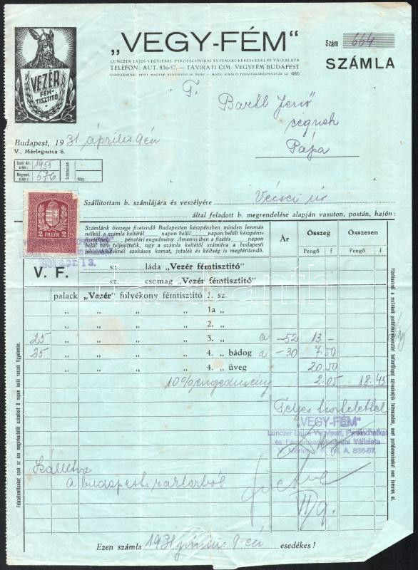 Beschreibung: 1931 "Vegy-Fém" Lunczer Lajos Vegyipari, Pyrotechnikai és Fémárúkereskedelmi Vállalata fejléces számla