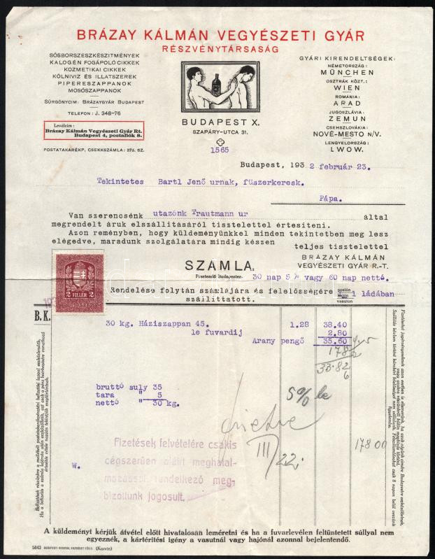 1932 Bp., Brázay Kálmán Vegyészeti Gyár, Brázay-féle sósborszesz fejlé... https://www.darabanth.com/de/450-Fernauktion/450.0/Kunst-Dokumente-andere-Sammelgebiete/Dokument~500022/1932-Bp-Brazay-Kalman-Vegyeszeti-Gyar-Brazay-fele-sosborszesz-fejleces-szamla~II2988395