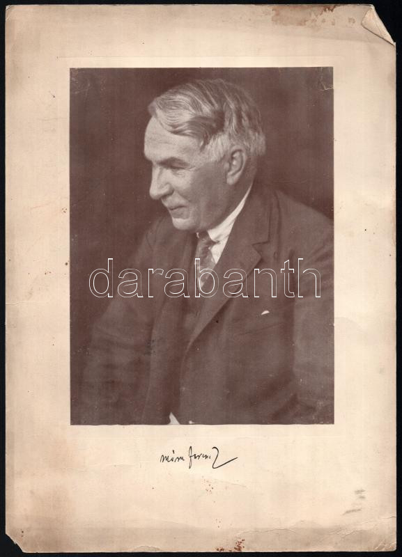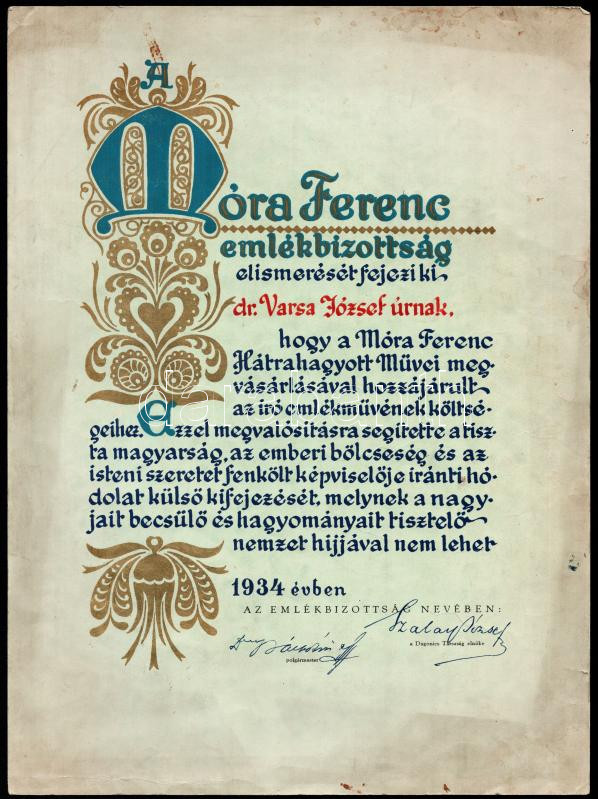 1934 Móra Ferenc emlékbizottság elismerő, díszes oklevele Varsa József részére, aki a Móra Ferenc Hátrahagyott Művei megvásárlásával hozzájárult az író emlékművének költségéhez. Pálfy József (1874-1944), Szeged polgármestere és Szalay József (1870-1937), Szeged rendőrkapitánya, a Dugonics Társaság elnökének, Móra Ferenc barátjának autográf aláírásaival. Ofszet, papír. Lap széle kissé foltos és apró szakadással. 33x24,5 + Móra Ferenc portré, nyomat, papírra kasírozva, alatta Móra nyomtatott aláírásával. Lap széle sérült, foltos és apró szakadással 34,5x24,5 cm