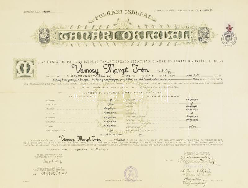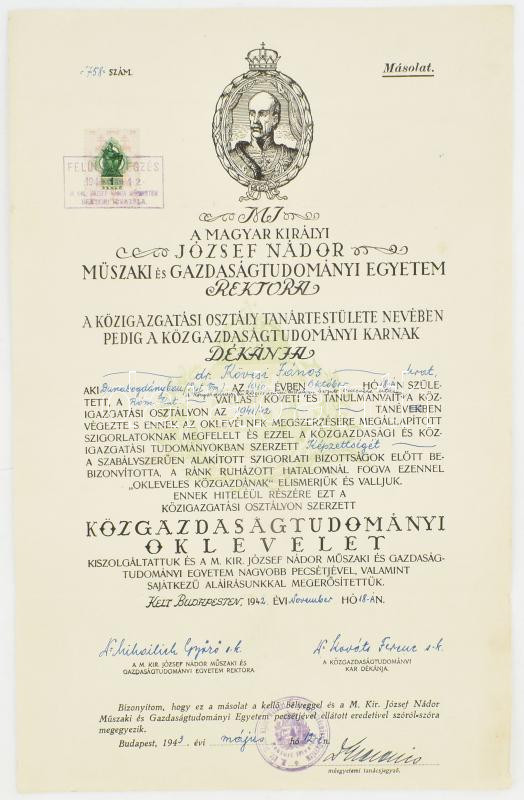 1935-1943 Közgazdaságtudományi oklevél + Polgári iskolai tanári oklevél, utóbbi többek közt Ábrahám Ambrus Andor (1893-1989) zoológus, ideghisztológus; Bognár Cecil Pál (1883-1967) bencés szerzetes, pszichológus és mások autográf aláírásaival, kissé sérült