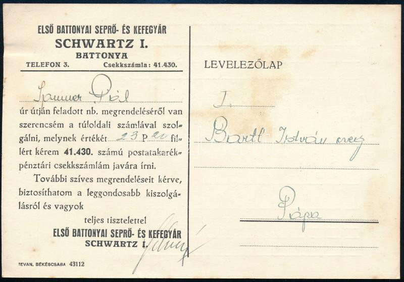 Beschreibung: 1938 Battonya, Első Battonyai Seprő- és Kefegyár fejléces számla / Levelezőlap