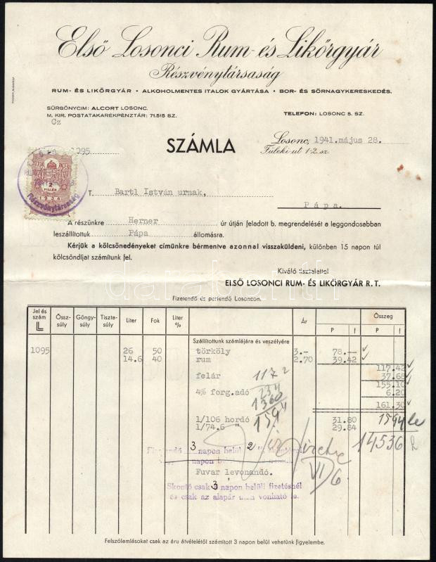 1941 Losonc, Első Losonci Rum- és Likőrgyár fejléces számla https://www.darabanth.com/de/450-Fernauktion/450.0/Kunst-Dokumente-andere-Sammelgebiete/Dokument~500022/1941-Losonc-Elso-Losonci-Rum-es-Likorgyar-fejleces-szamla~II2988654