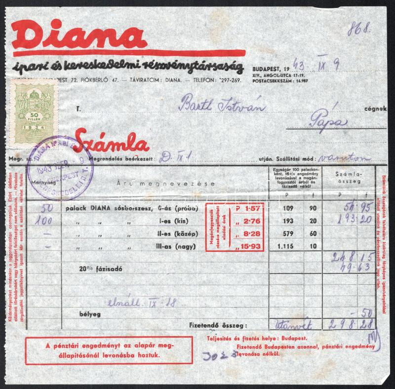 1942 Bp., Diana Ipari és Kereskedelmi R.T. fejléces számla https://www.darabanth.com/de/450-Fernauktion/450.0/Kunst-Dokumente-andere-Sammelgebiete/Dokument~500022/1942-Bp-Diana-Ipari-es-Kereskedelmi-RT-fejleces-szamla~II2988671