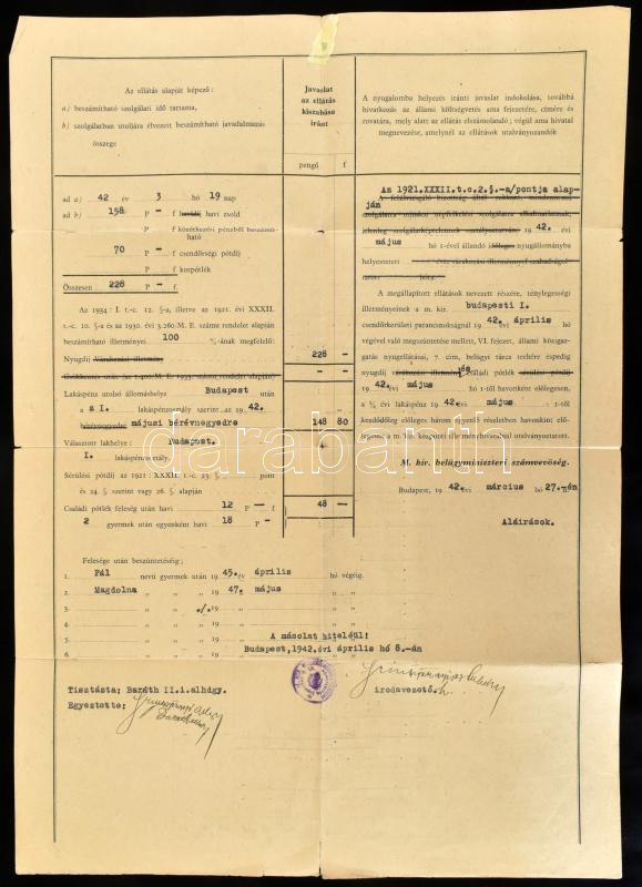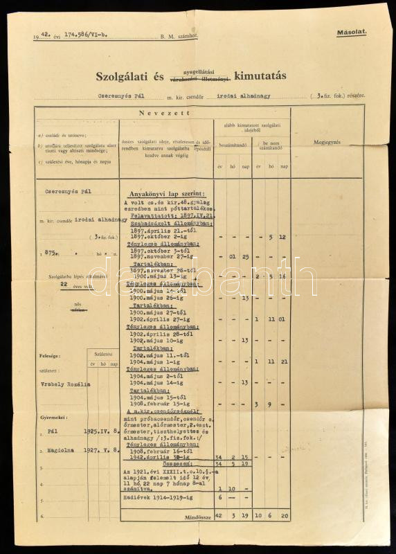Beschreibung: 1942 Cseresnyés Pál csendőr alhadnagy szolgálati kimutatása