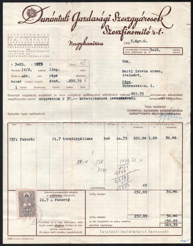 1943 Nagykanizsa, Dunántúli Gazdasági Szeszgyárosok Szeszfinomító R.T.... https://www.darabanth.com/de/450-Fernauktion/450.0/Kunst-Dokumente-andere-Sammelgebiete/Dokument~500022/1943-Nagykanizsa-Dunantuli-Gazdasagi-Szeszgyarosok-Szeszfinomito-RT-fejleces-szamla~II2988660